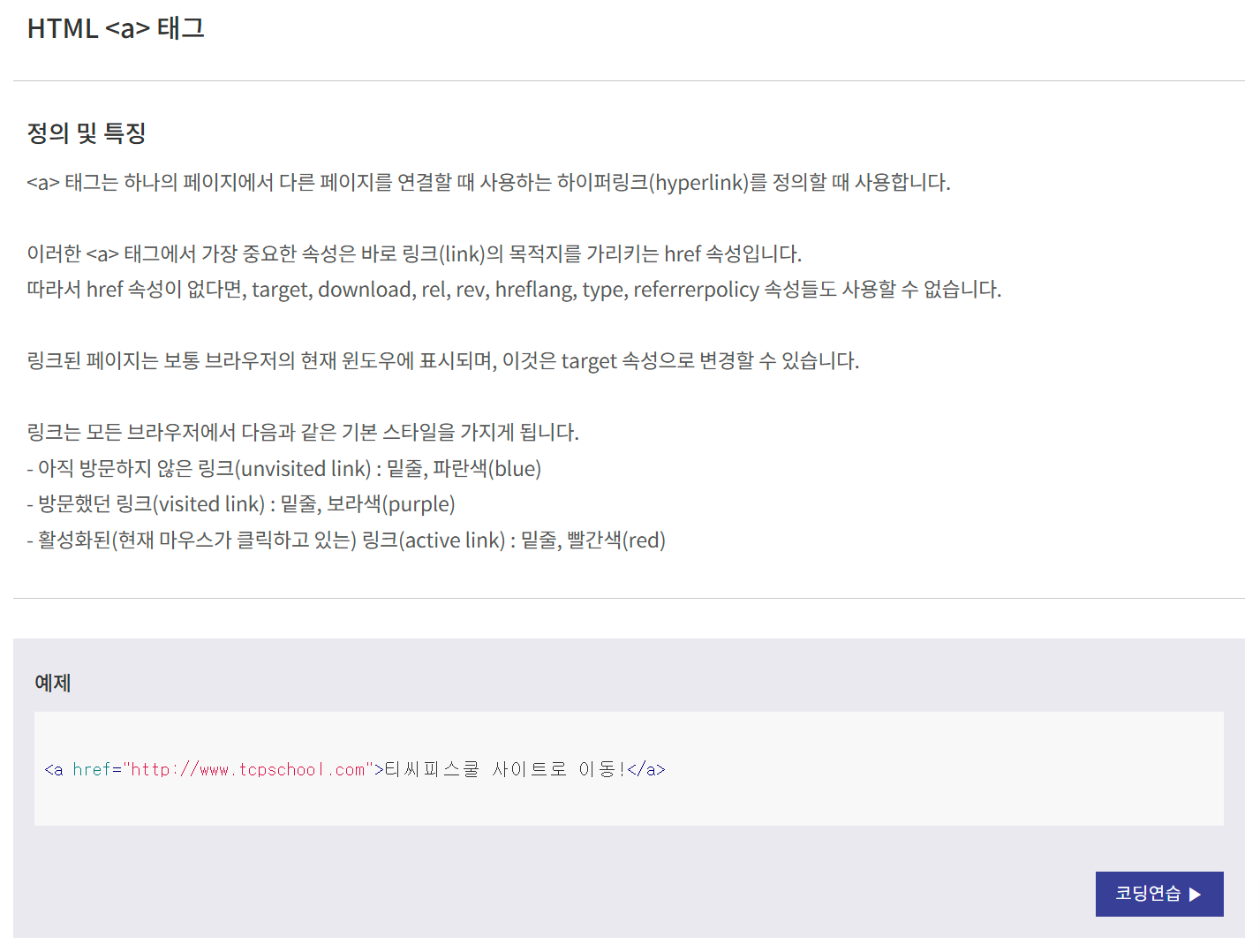 그 정의를 확인하기 위해 검색을 통해 아래의 사이트를 방문해서 a 태그에 대해 알아봤다.
